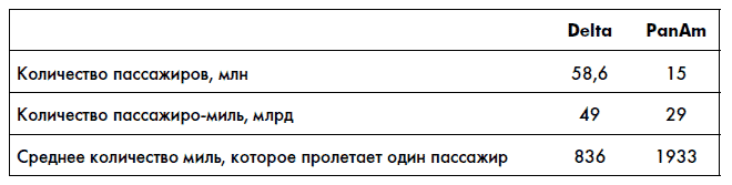 1. «Объективный» вариант – разница объясняется технологическими различиями использования воздушных судов. Если мы проанализируем данные компаний, то увидим, что PanAm бо?льшую часть выручки получает от трансатлантических, т. е. длинных перелетов.