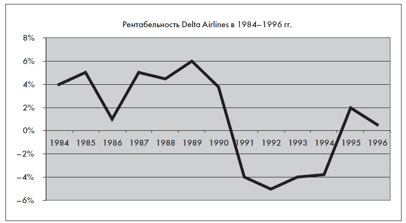 Что же произошло? Как вы можете догадаться, PanAm протянула недолго и в 1991 г. обанкротилась. Delta купила часть активов PanAm, прежде всего ее международные маршруты, таким образом продолжив экспансию. Однако и Delta не избежала трудностей. В начале 1990-х гг. в США наступила рецессия, связанная с ростом цен на нефть и войной в Кувейте. Суммарно за 1990–1993 гг. все американские авиакомпании получили убытки более чем в $12 млрд.