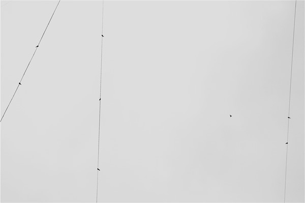 Бездонное небо перечеркнуто проводами. Неустойчивость равновесия птиц, сидящих на проводах. Одиночество той, что решила покинуть привычный насест. Большую надо иметь отвагу, чтобы так просто прыгнуть в небо и полететь куда-то.