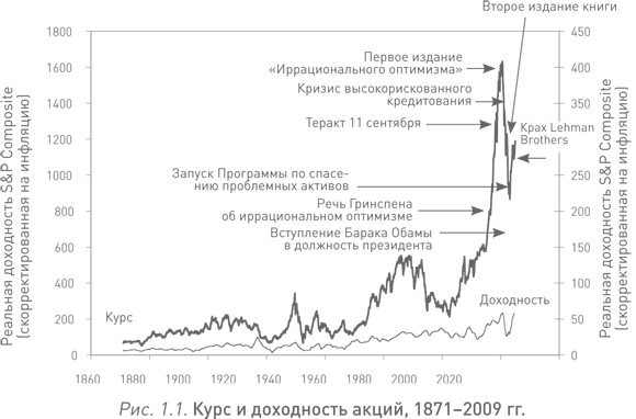 Сводный фондовый индекс S&P (скорректированный с учетом инфляции), рассчитываемый ежемесячно за период с января 1871 г. по май 2009 г. (верхняя кривая), и доходность S&P Composite, скорректированная на инфляцию, за период с января 1871 г. по декабрь 2008 г. (нижняя кривая).