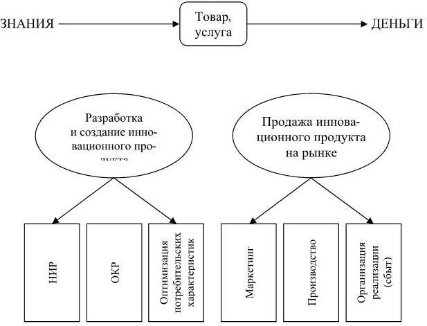 Процесс коммерциализации инновационной идеи – инновационный процесс – направлен на разработку и реализацию результатов научно-технических изысканий в виде нового продукта или нового технологического процесса. В общем плане инновационный процесс – это последовательная цепь событий, в ходе которой новшество «вызревает» от идеи до конкретного продукта, технологии или услуги и распространяется в хозяйственной практике (вводится в экономический оборот). Но инновационный продукт сначала необходимо получить (материализация инновационной идеи), а затем масштабно продать (потребительское распространение инновационного продукта). Таким образом, коммерциализация знаний (извлечение экономической выгоды) выполняется по формуле «ЗНАНИЯ – ТОВАР – ДЕНЬГИ» и включает следующие функциональные составляющие (рис. 2.3).
