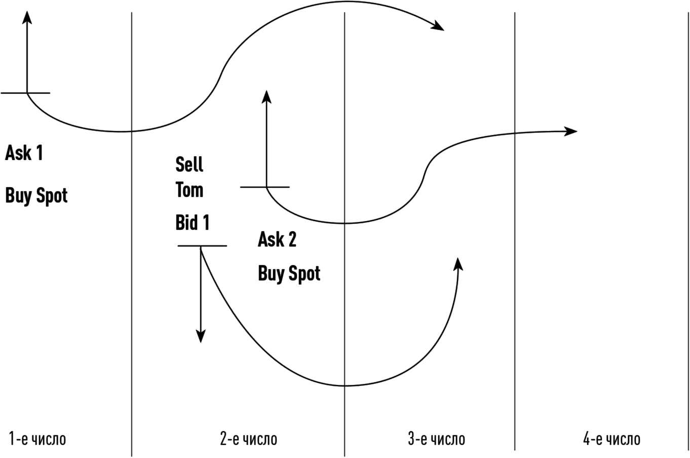 Tomorrow/next (tom/n) – первая сделка с валютированием завтра, вторая – на следующий день, послезавтра (спот), как на рис. 5.