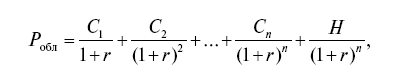 где С1, С2, С3, …, Сn – сумма купонных платежей; r – ставка дисконтирования; Н— номинальная стоимость облигации; n – число лет до погашения.