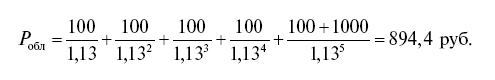Если рыночная доходность превышает купонную ставку, эмитент вынужден будет продавать облигацию по цене ниже номинала. Рассмотрим пример: компания выпустила конвертируемые облигации номиналом 1000 руб. сроком на пять лет, установив купонный доход в размере 10 %. Облигации с аналогичным уровнем риска, которые не могут быть конвертированы, приносят инвесторам доходность 13 %. Следовательно, в качестве ставки дисконтирования принимается 13 %. В этом случае внутренняя стоимость конвертируемой облигации составит: