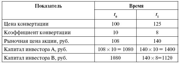 Рассмотрим пример. Компания продает инвесторам облигации по номиналу 1000 руб., каждую из которых можно обменять на 10 обыкновенных акций. Цена конвертации в этом случае составляет 100 руб. Таким образом, инвестор при покупке облигации заранее знает цену, по которой ему будут переданы акции в случае конверсии.