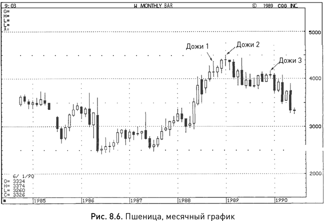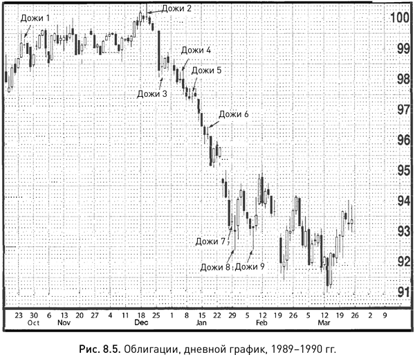На рисунке 8.6 первым признаком окончания ралли, начавшегося в середине 1987 г., стало образование дожи 1. Спустя несколько месяцев на графике появилась дожи 2, и рост прекратился, а затем незначительное повышение цен в конце 1989 г. завершилось формированием дожи 3. Здесь мы можем видеть, что вероятность разворота тренда возрастает при наличии подтверждающих сигналов свеч, идущих после дожи. Так, вслед за дожи 1 возникла белая свеча и, следовательно, рынок в тот момент еще не был готов к смене тенденции. После дожи 2 образовались повешенный и длинная черная свеча, подтверждающие медвежьи настроения у участников торгов. Длинная черная свеча возникла и после дожи 3, указывая на то, что цены действительно достигли вершины.
