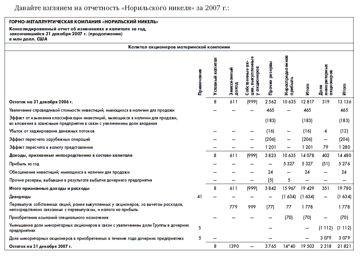 Как видите по отчету об изменениях в капитале, убыток от пересчета результатов зарубежных операций «Норильского никеля» в 2007 г. составил $55 млн. Неудивительно, поскольку курс рубля в 2007 г. вырос относительно доллара, в том числе и австралийского. По той же самой причине при пересчете консолидированной отчетности в валюту представления «Норильский никель» получил «прибыль» более чем в $1 млрд. Правда, все эти прибыли и убытки отражены не в P&L, а в отчете об изменениях в капитале, что позволяет избежать «затуманивания» отчетности несуществующими в реальности прибылями и убытками. Если бы это правило не действовало, и все курсовые разницы фиксировались бы в P&L, то просто за счет изменения валюты представления «Норильский никель» смог бы легко манипулировать своими финансовыми результатами, завышая прибыль.