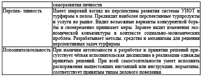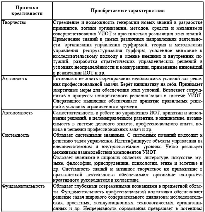 Современный креативный менеджер важный элемент в системе КУИОТ (табл.3.7). Это, прежде всего, творец и вдохновитель прогрессивных идей и их воплощения в жизнь. Только творческая личность может эффективно вести за собой коллектив сотрудников и создать систему управления нового типа, систему креативного управления ИОБПТ. Для этого система образования должна исходить из современных проблем туризма и чутко откликаться на вызовы времени.