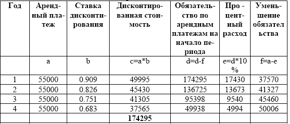 Приведенная стоимость арендных платежей равна 174295 рублей, что меньше чем стоимость оборудования по договору – 220 000 рублей.
