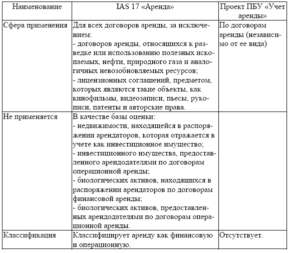 Фондом «Национальный совет по стандартизации финансовых отчетов» (далее – НСФО) по заказу Министерства Финансов Российской Федерации разработан новый проект положения по бухгалтерскому учету (ПБУ) «Учет аренды», который во многом схож с международным стандартом финансовой отчетности (IAS) 17 «Аренда». Главное принципиальное новшество ПБУ «Учет аренды», состоит в том, что аренда в большинстве случаев будет учитываться на балансе арендатора. Основные отличия IAS 17 от ПБУ приведены в табл. 2.