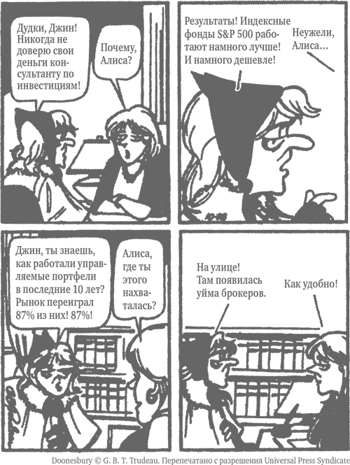 Я верю в теорию эффективности рынка уже более тридцати лет. И вера моя крепнет по мере появления все новых доказательств ее истинности. Широкие фондовые индексы регулярно обходили по результативности как минимум две трети активно управляемых фондов. В последние двадцать лет индексы еще убедительнее продемонстрировали свое превосходство, обойдя более 80 % активно управляемых взаимных фондов[41]. Гарри Трюдо дал совершенно верную картину в своем комиксе Doonesbury.