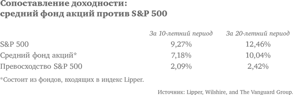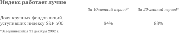 Следующая таблица еще более наглядно демонстрирует превосходство стратегии, заключающей в простой покупке индекса. Здесь сопоставляется доходность среднего активно управляемого взаимного фонда и доходность индекса S&P 500. Индекс переигрывает фонды на 2 процентных пункта в год.
