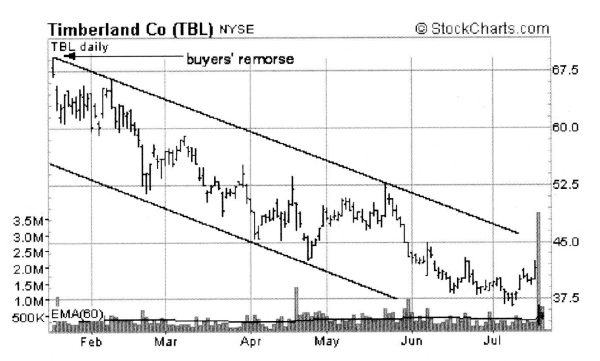 Инвесторы, прикупившие акции компании Timberland после выхода позитивных новостей, оказались в ловушке рекордно высокой цены, да еще при сильных дневных объемах. Это обычно ведет к «раскаянию покупателей», что происходит, когда быки чувствуют себя загнанными в угол и пытаются продать акции по цене покупки. Уже через две недели казалось, что несчастные быки вполне могут трансформироваться в гусей, которые вышли из воды сухими, когда общий подъем на фондовом рынке приподнял стоимость акций Timberland до уровня $66 за штуку. Но на этом уровне продавцы немедленно стали гнать цену вниз, и, уже спустя пару недель, она консолидировалась в районе значения $52. Не надеясь выйти из этой ситуации без потерь, трейдеры, купившие акции на пике, стали продавать их на любом более-менее значительном подъеме. Так было в начале марта, в середине апреля и в конце мая.