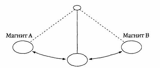 Любой трейдер, обладающий хоть небольшим опытом, знает, что рынки не являются простым механическим результатом спроса и предложения. Если бы люди были машинами, поведение акций было бы простой двухмерной системой сил предложения и спроса. Маятник, подвешенный между двумя магнитами, является простой двухмерной системой притяжения (см. Рисунок 2.2). Двухмерные системы притяжения просты, линейны и скучны. Двухмерный рынок не имел бы ни сложности, ни нелинейности, ни турбулентности, ни волатильности.