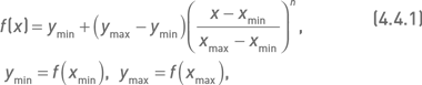 В дальнейших рассуждениях мы будем полагать ymin = xmin, ymax = xmax. В этом случае, если принять степенной показатель в формуле 4.4.1 равным 1, то весовая функция приобретает вид f(x) = xi, то есть превращается в простую линейную функцию. Для всех n > 1 данная функция является выпуклой (обозначим ее f+(x)), а для всех 0 < n < 1 эта функция будет вогнутой (обозначим ее f–(x)).