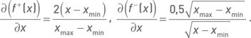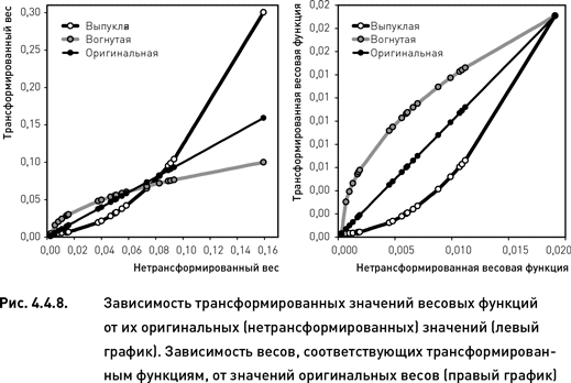 Для наших целей крайне важными будут характеристики чувствительности трансформированных функций к изменениям исходной весовой функции. Ниже мы опишем свойства выпуклой и вогнутой функций по отдельности для низких и высоких значений ее аргумента (исходной, нетрансформированной функции). Эти описания базируются на визуальном анализе левого графика рис. 4.4.8, а также на производных функции 4.4.1. Полагая ymin = xmin, ymax = xmax, производные выпуклой (n = 2) и вогнутой (n = 0,5) функций имеют вид: