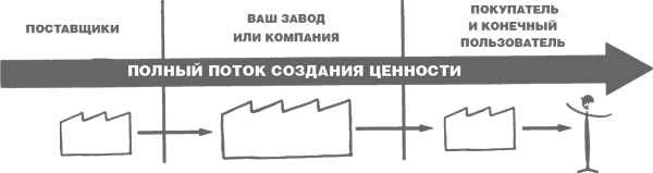 Такой взгляд на поток создания ценности означает, что мы смотрим на картину в целом, а не только на отдельные процессы и занимаемся совершенствованием целого, а не оптимизацией отдельных частей. Если вы действительно анализируете весь путь следования потока создания ценности – от концепции продукта до передачи товара потребителю, – вам придется пересечься со многими цехами, станками и даже фирмами. Однако начинать сразу с построения карты всего потока создания было бы затруднительным.