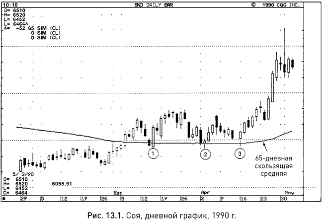 Во многих случаях я отдаю предпочтение 65-дневной скользящей средней – опыт показывает, что она хорошо работает на многих фьючерсных графиках. На рисунке 13.1 использована именно эта разновидность индикатора, выступившая в качестве поддержки в областях 1, 2 и 3. В моменты, когда рынок нашел опору, возникли бычья модель поглощения (в области 1), молот и харами (в области 2), а также молотообразная свеча (в области 3).