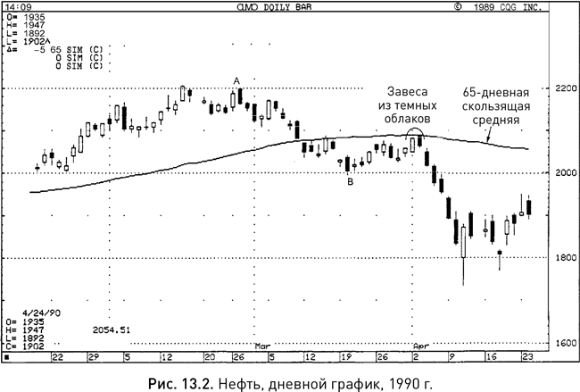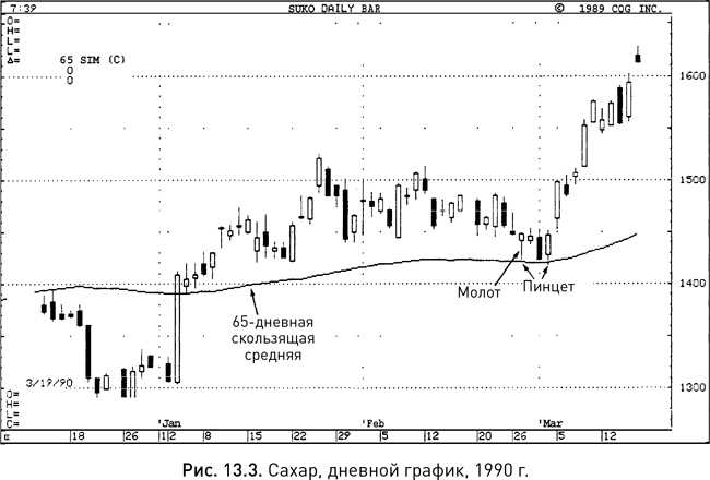 Как можно видеть на рисунке 13.3, в конце февраля проверка линии поддержки, соответствующей 65-дневной скользящей средней, была подкреплена молотом. Через несколько дней рынок вновь безуспешно попытался прорвать эту линию, в ходе чего образовалось основание «пинцет».
