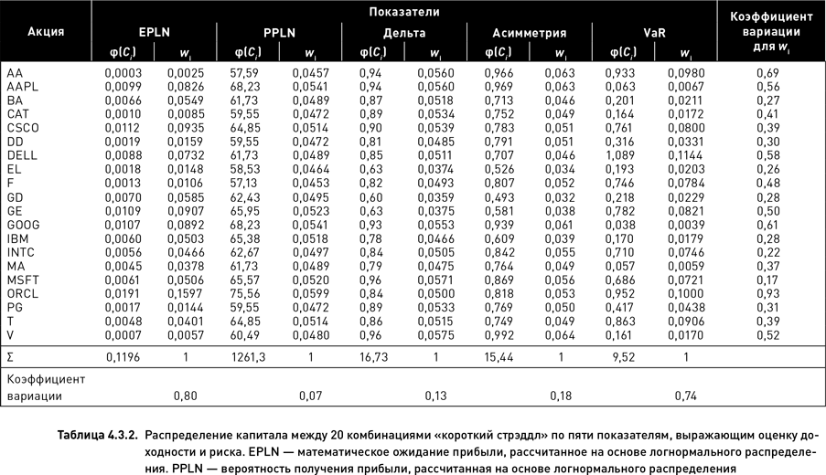 В таблице 4.3.2 приведены значения весовых функций и соответствующих им весов для всех трех показателей риска. Кроме того, в этой таблице показаны значения коэффициента вариации весов (отношение стандартного отклонения к среднему) для каждой отдельно взятой акции и для каждого показателя. Среди акций наиболее высокий коэффициент вариации наблюдается для ORCL (0,93). Это означает, что среди всех 20 базовых активов объем капитала, инвестируемого в комбинацию ORCL, зависит в наибольшей степени от выбора показателя для распределения капитала. Действительно, из данных таблицы 4.3.2 следует, что если капитал распределяется по математическому ожиданию прибыли, то доля ORCL в общем портфеле составит менее 2 %. Если же для распределения капитала используется показатель VaR, то ORCL будет составлять 10 % портфеля. Наиболее низкий коэффициент вариации наблюдается для акции MSFT (0.17). Это означает, что среди всех базовых активов объем капитала, инвестируемого в MSFT, практически не зависит от выбора показателя. Какой бы показатель ни использовался для распределения капитала, доля MSFT в общем портфеле будет варьировать в очень узком диапазоне (от 5 до 7 %).