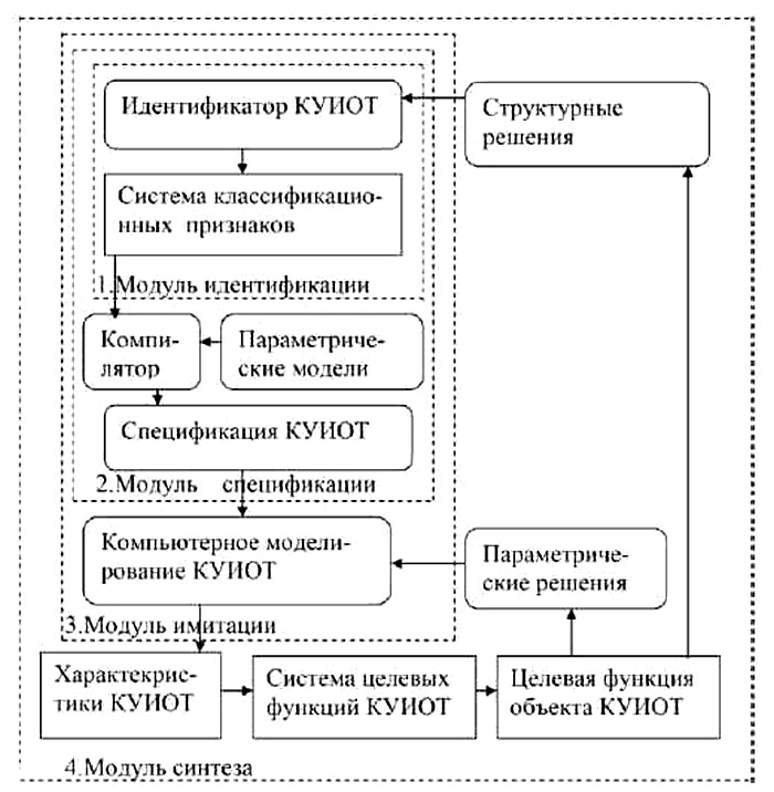 На основе вышеизложенных методологических условий общую концептуальную схему создания КУИОТ можно отобразить средствами структурно-параметрического синтеза, основанного на морфологии систем. С позиций системного подхода данный вид синтеза в общей постановке представляется наиболее адекватным сущности КУИОТ. С учётом содержания КУИОТ и методологических условий построим обобщённую схему синтеза систем КУИОТ (рис. 2.3). Синтез систем КУИОТ можно представить совокупностью модулей. Каждый модуль реализует определённый уровень синтеза. Первый уровень представляет собой модуль идентификации структуры КУИОТ. Идентификация может быть выполнена заданием морфологического множества, в частности, классификацией в виде рисунка или таблицы. Морфологическое множество можно упорядочить различными способами, создавая системы классификационных признаков. Этот модуль идентифицирует структуру КУИОТ, но не обеспечивает получение его спецификации.