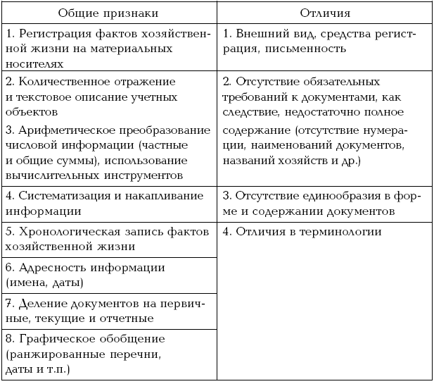 Экономическая функция бухгалтерского учета проявлялась (и проявляется) в информационной имитации хозяйственной деятельности. Все документы, начиная с древнейших времен, содержали конкретное описание учетных объектов и их количественное измерение. Сравнение признаков документального учета древности с современными требованиями позволяет выделить как различия, так и сходства (табл. 7.1).