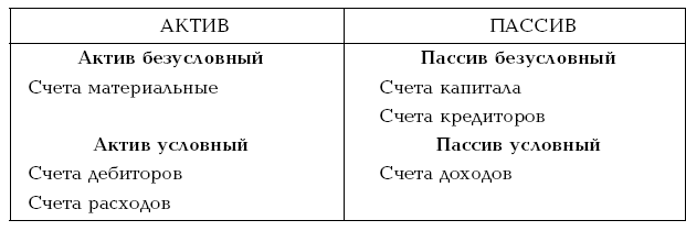 Аналогичные рассуждения приведены для пассива баланса, который состоит из безусловного пассива, образованного счетами фондов (капитала) и кредиторов, и условного пассива, состоящего из счетов доходов (табл. 4.4).