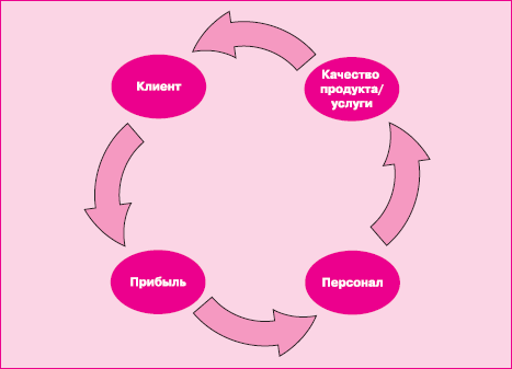 В упрощенном виде маркетинг отношений можно представить в виде цикла (рис. 4.7), объединяющего такие объекты управления, как клиент (его удержание, удовлетворение, лояльность); качество продукта (услуги); персонал организации (его лояльность к маркетингу вообще и маркетингу отношений в частности); прибыль организации, увеличенная за счет удержания клиента.