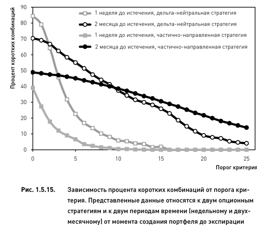 Соотношение длинных и коротких комбинаций. Как и в случае дельта-нейтральной стратегии, в период высокой волатильности все портфели, построенные в рамках частично-направленной стратегии, состоят преимущественно из коротких комбинаций. В период спокойного рынка процент коротких комбинаций от общего количества комбинаций в портфеле зависит от величины порога критерия и не зависит от ширины диапазона страйков (это также совпадает с паттернами, наблюдавшимися для дельта-нейтральной стратегии, см. рис. 1.4.13). Поэтому, чтобы лучше отобразить зависимость доли коротких комбинаций от порога критерия и сравнить между собой две стратегии, мы усреднили данные, относящиеся к разным диапазонам страйков (что позволяет свести поверхности графиков к линиям). Независимо от периода времени, остающегося до истечения опционов, доля коротких комбинаций в портфеле падает по мере роста порога критерия. Причем в портфелях, сформированных из ближайших опционов, это падение происходит более быстрыми темпам, а доля коротких комбинаций ниже, чем в портфелях, состоящих из дальних опционов. Такие же тенденции наблюдались и для дельта-нейтральной стратегии (рис. 1.5.15). Основное отличие двух стратегий состоит в том, что при использовании краткосрочных опционов, доля коротких комбинаций в портфелях, сформированных в рамках частично-направленной стратегии, всегда ниже, чем в дельта-нейтральных портфелях (независимо от величины порога критерия). При использовании долгосрочных опционов доля коротких комбинаций в частично-направленных портфелях ниже для низких значений порога критерия, но становится выше, чем в дельта-нейтральных портфелях, когда порог критерия превышает 10 %.