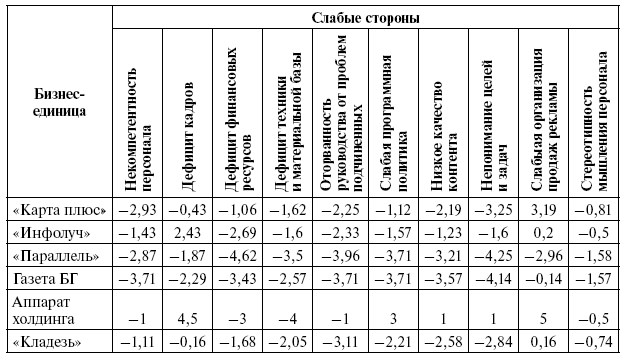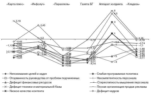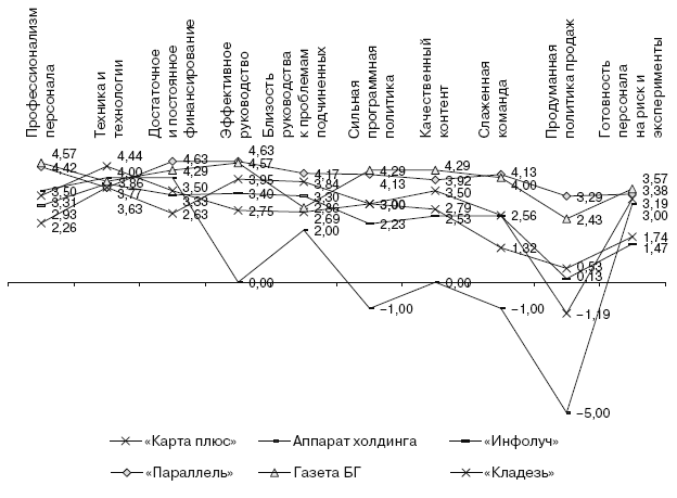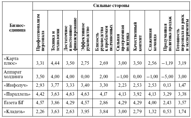 Оценка сильных сторон компаний респондентами оказалась парадоксальной. По логике вещей респонденты должны были оценить сильные стороны по принципу «от обратного», т. е., указав какую-либо сторону в качестве слабой, они не должны были соответствующий критерий отмечать как сильную сторону. Иными словами, если респондент оценил на —5 неэффективную организацию продаж рекламы, то он не мог уже оценивать на 5 эффективную ее организацию. В идеале получилась бы матрица, где сильными сторонами реально были бы те, которые респонденты оценивают менее всего как слабые стороны. На практике этого не произошло. Респонденты оценили как сильные зачастую те же стороны, которые до этого оценивали как негативные. Поэтому оценки за сильные стороны оказались в целом по холдингу выше.