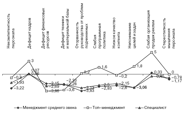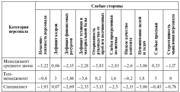 Оценки топ-менеджеров в целом (к этой категории мы отнесли главных редакторов компаний и руководство холдинга) в отношении слабых сторон заметно отличаются от оценок менеджеров среднего звена (руководителей) и специалистов (сотрудников, у которых нет подчиненных). Например, топ-менеджеры слабыми сторонами считают плохую организацию продаж рекламы, дефицит кадров и непонимание целей и задач. Это свидетельствует о том, что проблема трансляции и формулирования таковых гораздо острее стоит на высшем управленческом уровне холдинга (рис. 3.4. и табл. 3.2).