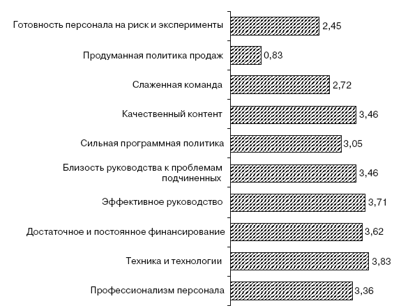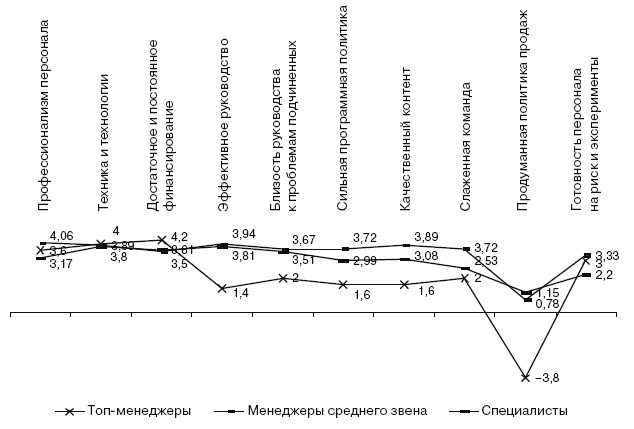 Предоставлять информационные услуги другим сторонним организациям. Мы в этом плане работаем, но недостаточно, я думаю, чего-то нам не хватает (генеральный директор медиахолдинга). Что касается оценок сильных сторон менеджерами среднего звена, они почти не отличаются от идеализированных представлений специалистов в отношении эффективности руководства, заботы начальства о подчиненных. Однако заметно снижены в оценках слаженности команды, качества контента и программной политики, а также готовности персонала на риск и эксперименты (рис. 3.7 и табл. 3.4).