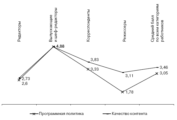 Оценка сильных сторон контента (программная политика и качественный контент) разнится у творческих и остальных работников. Если шеф-редакторы, выпускающие редакторы и корреспонденты оценивают программную политику и качество контента выше, чем все категории сотрудников, то режиссеры и редакторы – ниже, чем все категории (рис. 3.8).