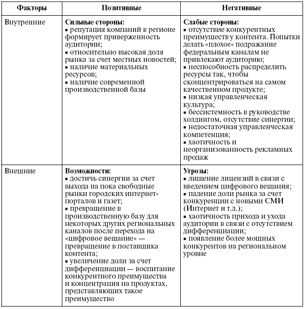 Так или иначе, на основе экспертизы оценок сотрудников, управленческого анализа и диагностики контента мы можем выделить основные сильные и слабые стороны, возможности и угрозы, подстерегающие компании и весь холдинг. Они представлены в табл. 3.5.