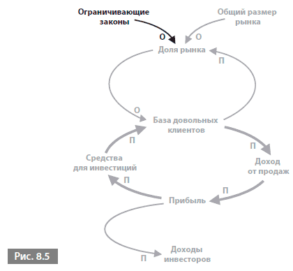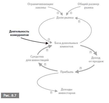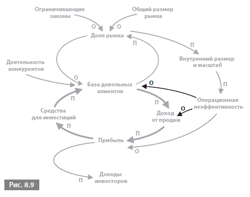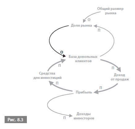 Однако по мере роста доли рынка, как правило, становится все труднее привлекать новых клиентов. Это означает, что нам нужно ввести еще одну связь типа О между долей рынка и базой довольных клиентов (рис. 8.3).