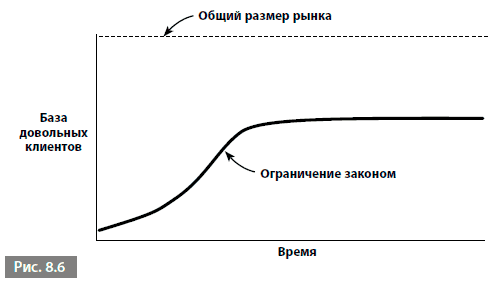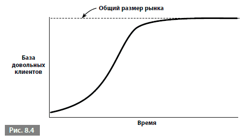 И тут вступает в действие уравновешивающая петля, которая начинает тормозить рост усиливающей петли и жмет на тормоза все сильнее, пока рост не останавливается, а база довольных клиентов не ограничивается общим размером рынка (рис. 8.4).