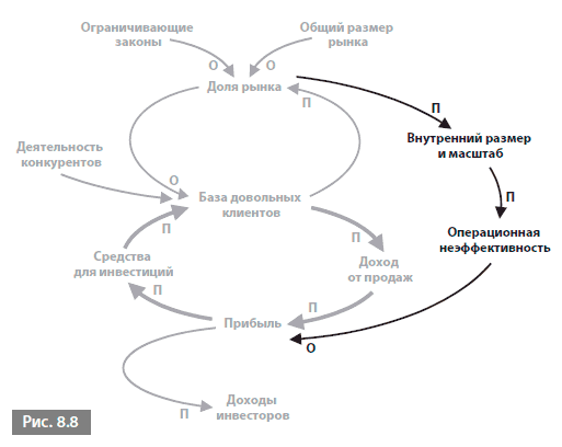 Эти два новых элемента отражают множество ситуаций. По мере роста бизнеса, как показывает увеличение доли рынка, внутренний размер и масштаб бизнеса возрастает, и в результате управление компанией усложняется. Возрастает операционная неэффективность: системы становятся громоздкими, внутренние коммуникации нарушаются, кто-нибудь решает построить новый роскошный головной офис. Стоимость неэффективности снижает прибыль и ограничивает рост: вы видите уравновешивающую петлю, связывающую долю рынка, внутренний размер и масштаб, операционную неэффективность, прибыль, средства для инвестиций, базу довольных клиентов и снова долю рынка?