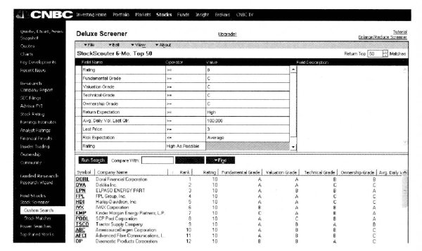 Для нахождения списка из 50 акций, наиболее подходящих для портфельной 6-ти месячной торговли, постройте запрос в системе StockScouter на сайте MSN Money. В конце сентября 2002 года главными кандидатами на включение в портфель были мелкие региональные банки, поставщики энергоносителей, производители лекарств, розничные торговцы и компании высоких технологий.