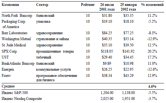 Специалисты Camelback также протестировали несколько инвестиционных портфелей из 10 акций. При отборе 10 таких акций следует начинать с 15-20 штук, сокращая список таким образом, чтобы по возможности диверсифицировать секторные риски. Например, в августе 2001 года я создал для читателей моей колонки портфель из 10 самых высокорейтинговых бумаг, приведенных в Таблице 4-2, убрав из первоначального списка несколько региональных банков и достигнув большей диверсификации по секторам и степени рыночной капитализации.