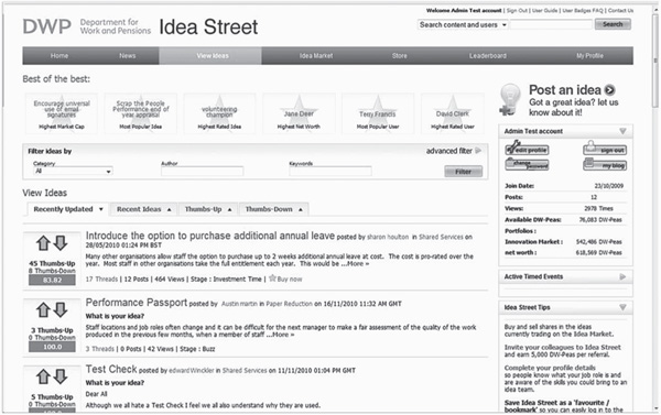 Когда вы думаете об инновациях, предложенных сотрудниками, вряд ли вам на ум приходят правительственные учреждения. Но британское Министерство труда и пенсий (МТП) известно как один из лидеров в воплощении инновационных подходов, предлагаемых его собственными служащими. «Улица идей», геймифицированная площадка для инноваций, стала местом, где сотрудники могут делать конструктивные предложения и где они затем претворяются в жизнь (см. рис. 5.1). Это произошло как нельзя вовремя. В эпоху программ строгой экономии, охвативших всю Европу, МТП остается крупнейшей правительственной структурой Великобритании. Оно распоряжается почти 28 % государственного бюджета, тратя 121 миллиард фунтов (более 190 миллиардов долларов США) и предоставляя широчайший спектр услуг – включая разработку пенсионных и благотворительных программ – с помощью 120 тысяч служащих.