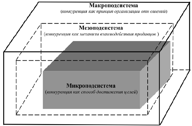 Между подсистемами конкуренции имеется соподчиненность. Макроподсистема, обеспечивая действие конкурентного принципа как универсальной (всеобщей) нормы, которой подчинено действие других подсистем конкуренции. Микроподсистема реализует конкурентный принцип в рамках отдельного отраслевого рынка. Она подчинена действию мезоподсистемы, которая обеспечивает реализацию этого принципа на межотраслевом уровне. Наличие управляющих и управляемых подсистем указывает на уровневый характер устройства конкуренции. Однако в основе сопод-чинённости подсистем лежит не иерархический принцип (доминирование – подчинение), а степень универсальности действия каждой из них. Для системы конкуренции характерна интегральная соподчинённость, а ее устройство сродни устройству матрёшки, как показано на рисунке 4.2. Микроподсистема «упакована» в мезоподсистему, которая «упакована» в макроподсистему.