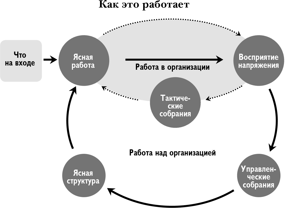 Таким образом, холакратия берет некоторые функции организационного дизайна, которые традиционно принадлежат генеральному директору или коллективу высшего руководства, и присваивает их процессам, которые осуществляются по всей организации и в которых участвуют все без исключения. Такой управленческий процесс, распределяющий полномочия и определяющий взаимные ожидания во всей организации, опирается на тех, кто выполняет работу и при этом выявляет точки напряжения. Точки напряжения в управленческом процессе используются для того, чтобы не только отвечать на вопросы, кто какие решения и в каких рамках принимает, но и формулировать, какие ожидания могут предъявлять окружающие к тем, кто применяет те или иные полномочия. Управленческий процесс обеспечивает ясность на уровне всей организации, а затем непрерывно эволюционно развивает ее, чтобы интегрировать в нее новейшую информацию, усвоенную участниками команды, и адаптировать ее к меняющейся внешней обстановке.