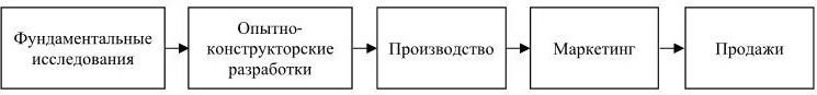 Линейные модели инновационных процессов определяются однонаправленностью хода реализации инновационных проектов и представлением в виде четко установленной последовательности отдельных стадий процесса. Основным достоинством простой линейной модели является однозначность структуры инновационного процесса. Основываясь на такой модели, можно четко установить перечень основных задач, подлежащих решению на каждой из стадий, однозначно распределить между подразделениями предприятия ответственность за выполнение таких задач и спроектировать систему необходимых взаимосвязей между подразделениями.