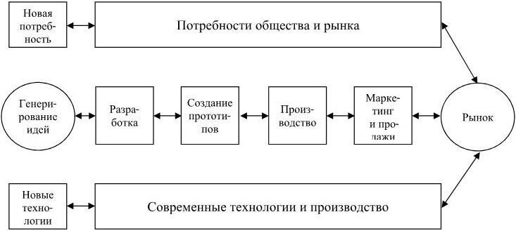 Данная модель отражает предположение о том, что отдельные стадии инновационного процесса могут выполняться неоднократно, поскольку может иметь место возврат всего процесса на предшествующие стадии (через обратные связи). Кроме того, принимаемые решения на каждой стадии согласуются с потребительскими требованиями (рыночной конъюнктурой) и опираются на существующую технологическую (производственную) базу.