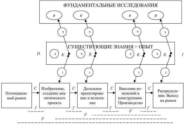Четвертая цепь K (Knowledge) в качестве источников инноваций (а также научно-теоретической и прикладной базы, обеспечивающей решение возникающих проблем на разных стадиях) в первую очередь выделяет область существующих знаний и практического опыта (стрелка «1») и во вторую очередь – новые фундаментальные исследования R (research) для создания нового знания (стрелки «2» и «3»), если существующих знаний недостаточно для решения проблем, возникающих на протяжении центральной цепи С инновационного процесса.