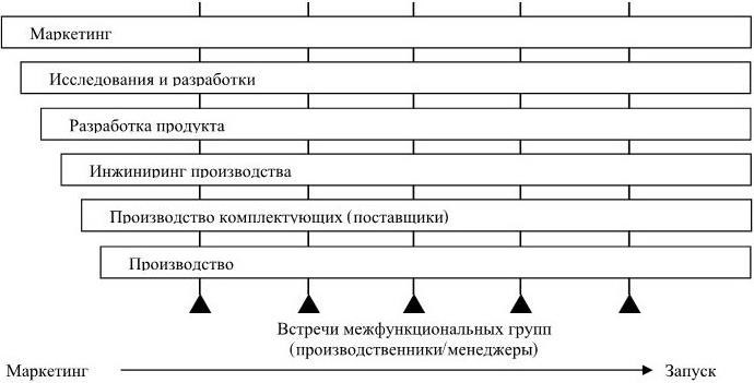 Интегрированная модель отражает непрерывное взаимодействие подразделений и служб предприятия, межфирменную кооперацию (создание совместных предприятий, стратегических альянсов, аутсорсинг8), более тесное сотрудничество с поставщиками, параллельное выполнение работ, мероприятий, процедур, а также создание межфункциональных рабочих групп, объединяющих технологов, конструкторов, маркетологов, экономистов, координирующих все этапы инновационного процесса, при этом существуют контрольные точки для принятия решений.