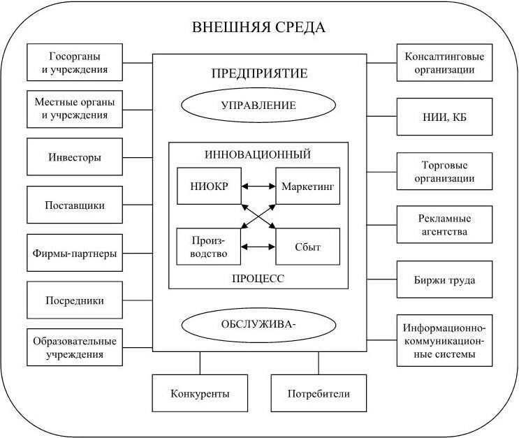 Процесс нововведения – это процесс взаимодействия внутренних подразделений предприятия и внешних институтов. Поэтому схема инновационного процесса, представленная на рис. 2.9, дополняется внешней сетью взаимодействий с различными субъектами из институционального окружения, в котором протекает процесс разработки и реализации новшества.