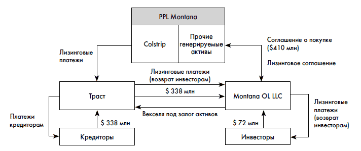 С этой целью привлеченные инвесторы создали специальную компанию Montana OL LLC (так называемая структура специального назначения – Special Purpose Entity, или SPE). В эту компанию инвесторы внесли $72 млн. На оставшиеся $338 млн Montana OL LLC получила кредит. Montana OL LLC выкупила у PPL Montana долю в Colstrip и немедленно передала ее обратно PPL Montana в лизинг на 36 лет. Для защиты интересов кредиторов платежи перечислялись не Montana OL LLC, а трасту, организованному с помощью Chase Manhattan Bank. Траст получал платежи, вычитал из них долю, причитающуюся кредиторам, а остаток перечислял Montana OL LLC для передачи инвесторам компании.