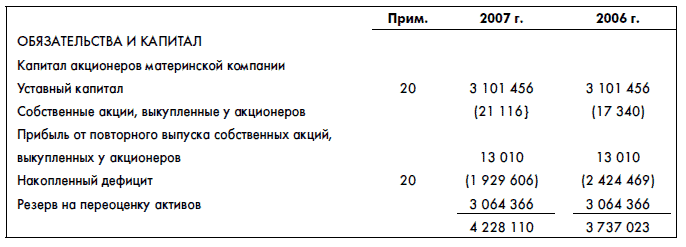 Накопленный дефицит по итогам 2007 г. отражен в консолидированном балансе группы и составляет 1 929 606 тыс. руб., что на 494 863 тыс. руб. меньше, чем на 31 декабря 2006 г. Накопленный дефицит рассчитан группой при формировании вступительного баланса по МСФО по состоянию на 31 декабря 2002 г. При этом основными корректировками, отнесенными на начальное сальдо нераспределенной прибыли, стали: эффект от применения МСФО № 29 «Финансовая отчетность в условиях гиперинфляции», неучтенный налоговый актив, отражение расходов и обязательств в те периоды, к которым они относятся, учет инвестиций в ассоциированные компании по методу долевого участия, прочие резервы и списания.
