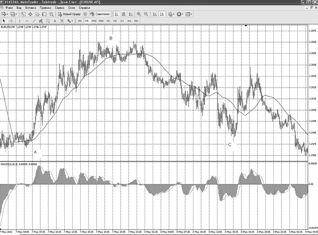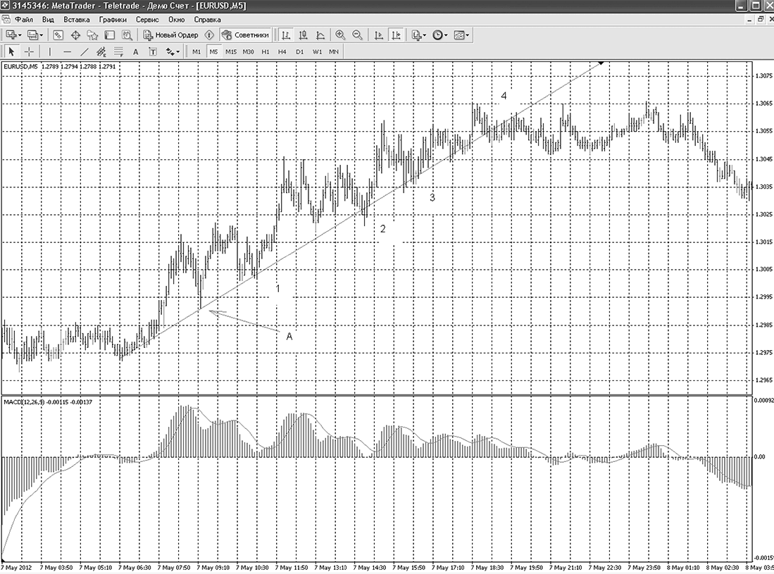 Рис. 81. Курс евро/долла, период – 5 минут, май 2012 г. Осциллятор MACD уже в точке 2 показывает сильнейшую перезакупленность